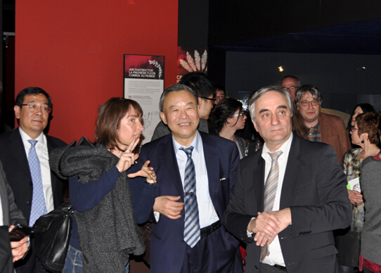 法国南特自然史博物馆吉野馆长(右1)、中国驻法国大使馆李少白参赞(左1)及必赢官网孙革教授(右2)等在展览大厅