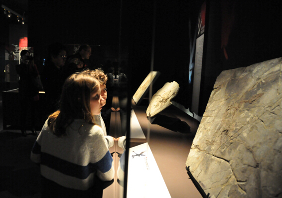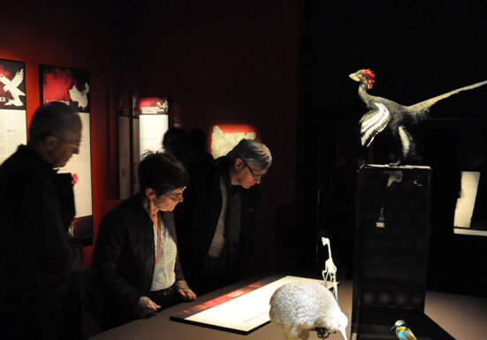 法国观众参观辽宁古生物博物馆参展的“赫氏近鸟龙”化石