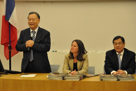 开幕式上,法国南特市罗兰市长(中)及中国驻法国大使馆李少白参赞(右)分别致辞;孙革教授(左)代表中国代表团应邀讲话