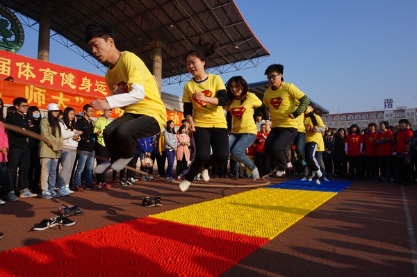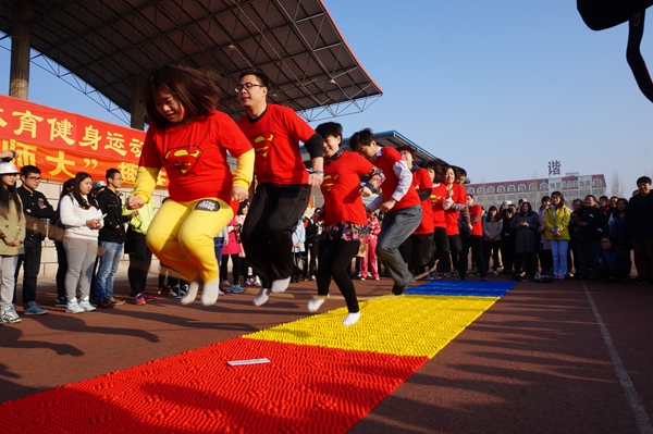 副校长夏敏亲临现场并参与活动。活动以师生趣味互动竞技为主要内容,注重团队协作意识和励志精神的培养,精心设计了“趾压板跳大绳”、“自行车载人接力赛”、“两人三足撕名牌”等项目。22个学院分别组建了学生代表队,每队10人。新颖的形式和热闹的气氛,团队的力量和拼搏的精神吸引了300余名自发晨练的学生前来参与,他们组成了粉丝团,纷纷为参赛的师生们加油助威。刹时,北区体育场变成了欢乐的海洋。