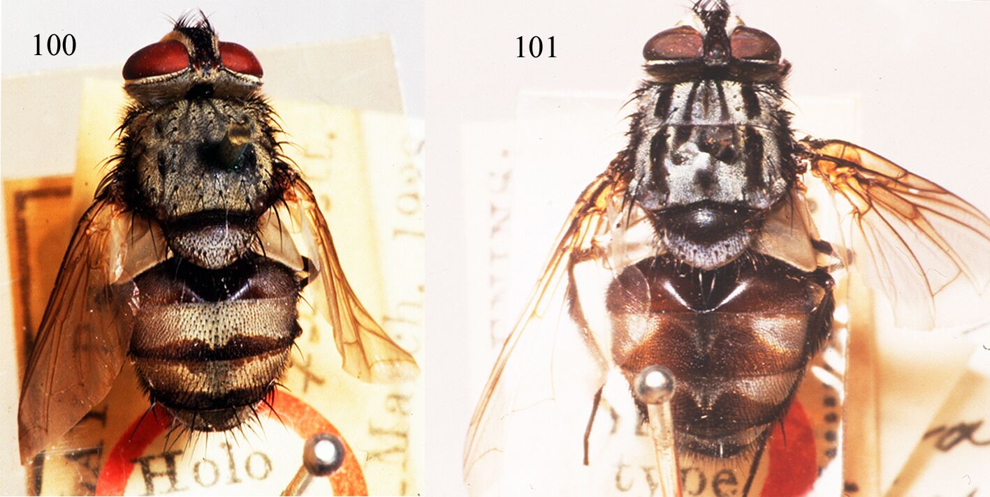 保存在英国伦敦自然史博物馆的马来篦寄蝇和壮篦寄蝇模式标本背面照,图100–101. Billaea