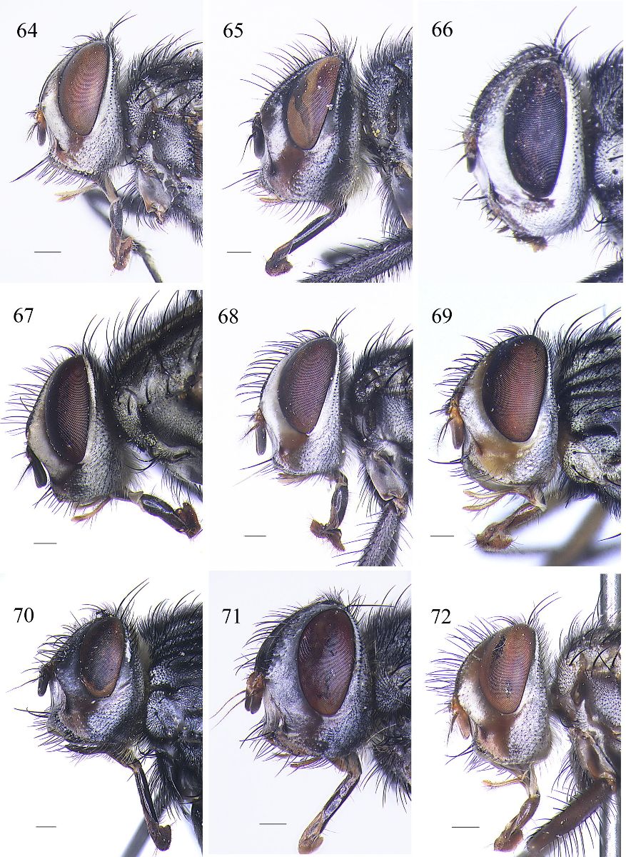 本研究部分新种和已知种头部侧面照,图64–72. Billaea spp., heads of male in lateral view. 64. B. atkinsoni. 65. B. brevicauda sp. nov. 66. B. carinatus sp. nov. 67. B. chinensis sp. nov. 68. B. ficorum. 69. B. flava sp. nov. 70. B. fortis. 71. B. kolomyetzi. 72. B. kurahashii sp. nov. 比例尺= 0.5 mm.