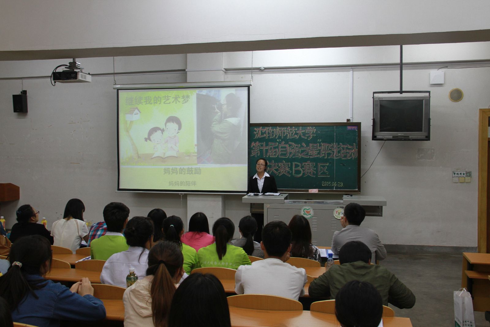 每名学生都有不同的人生经历,也都有不同的奋斗过程。20名选手用自身经历对自强做了最生动的诠释,他们自强不息的精神感动着现场的评委和每一位观众。来自外国语学院12级宋玉同学的艰辛历程让观众落泪,而他的坚强又赢得了阵阵掌声。“不能拼爹,不能拼妈,也拼不了脸,那我只有拼命了”,学前与初等教育学院13级郑颖同学的每一句话都传递着自立自强自信,乐观向上的生活态度感染了现场每个人;戏剧艺术学院14级孙亚楠同学,贷款创办辅导班,至今已经发展为四家“星乐” 连锁辅导班,并为贫困的农村孩子免费辅导功课。