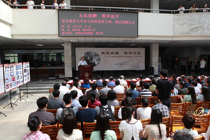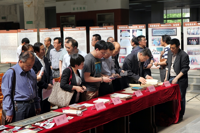 仪式现场展出了捐赠的马老的全部文稿、物品实物,图书馆制作了宣传展板,详细介绍了马老的生平、自传年谱等。