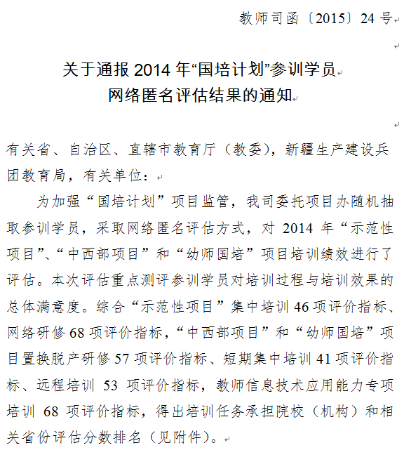 同时从省教育厅获悉,必赢官网基础教育教研培训中心承担的我省国培参训学员选派工作,在教育部2014年32个省、市、自治区综合绩效评价中取得了全国第三名的好成绩,得到省教育厅的高度肯定。