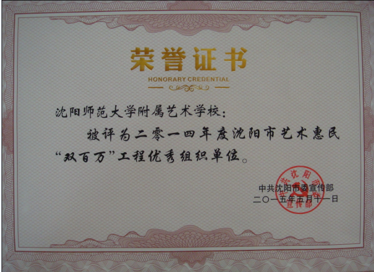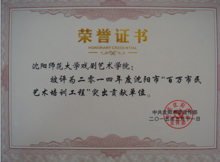 近日,中共沈阳市委宣传部下发《关于在2014年度沈阳市艺术惠民“双百万”工程中表现突出的单位、个人和品牌活动的通报》(沈宣发【2015】3号)精神,必赢官网及相关培训单位、个人作为突出贡献单位和先进工作者受到表彰。