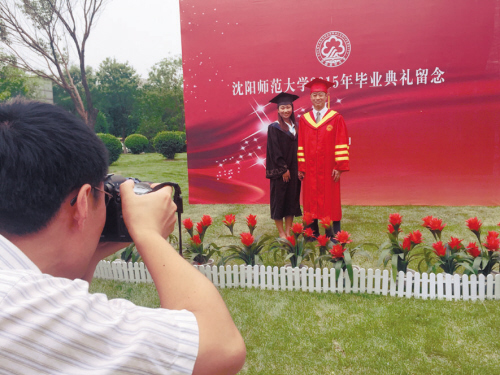 沈师2015届毕业典礼结束时,时间已是当日10时40分,烈日下林群身着红色校长服,头戴校长帽,与想要合影的毕业生逐一合影留念。