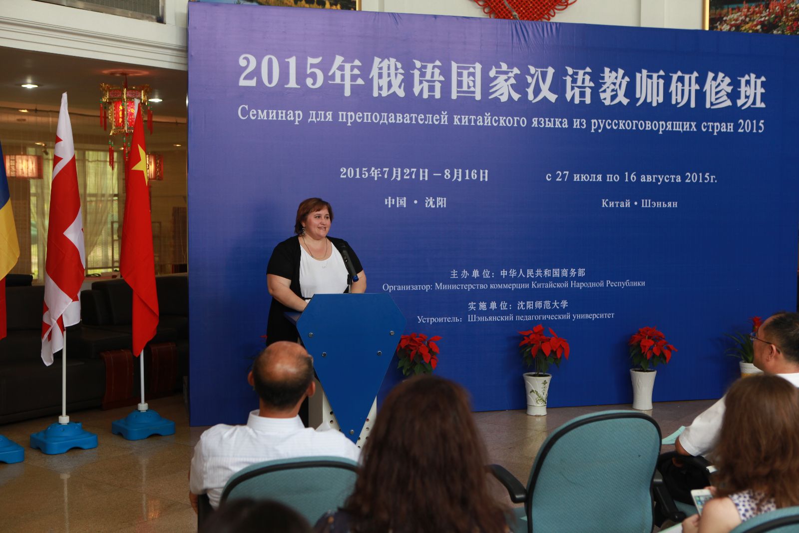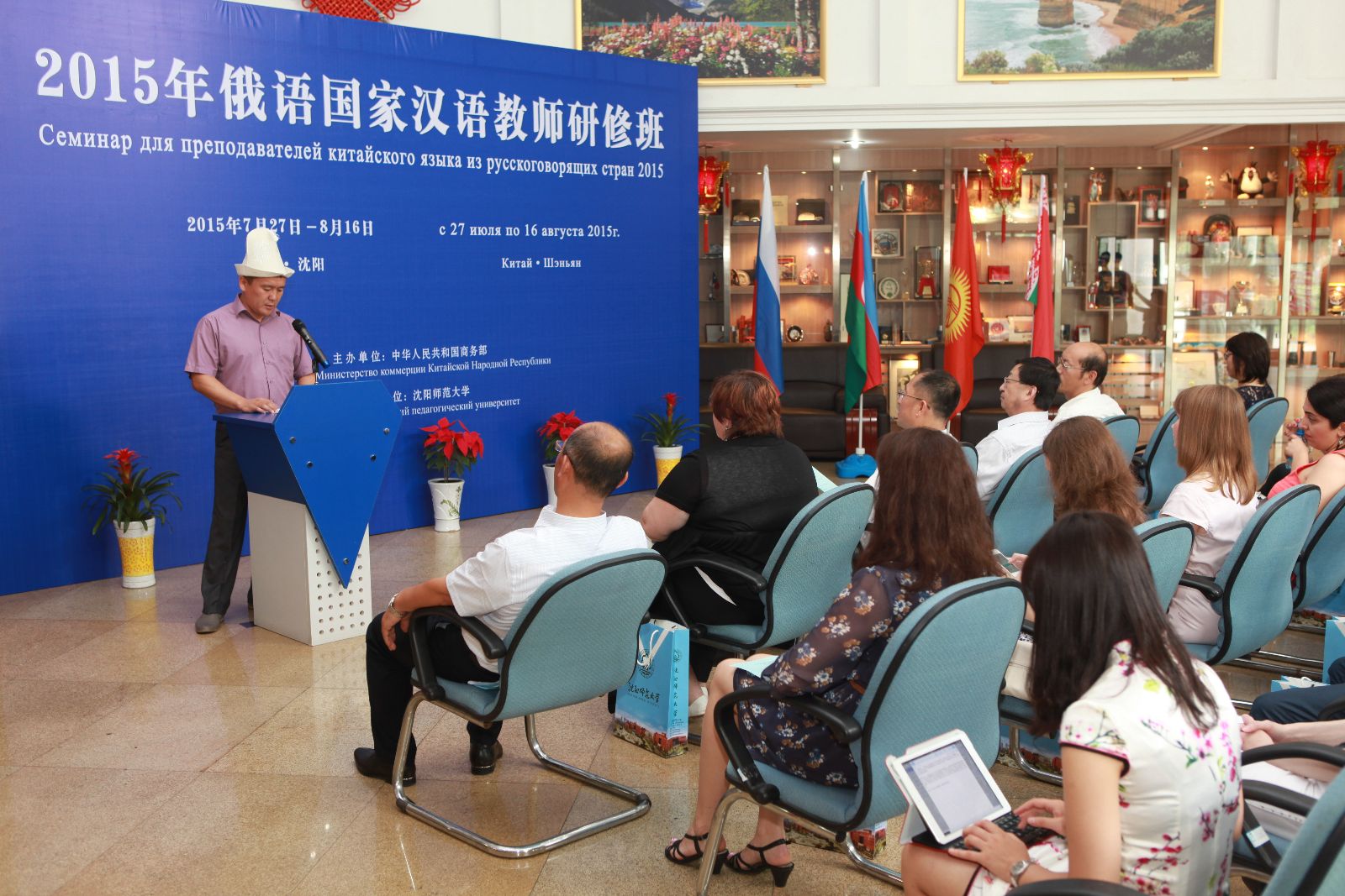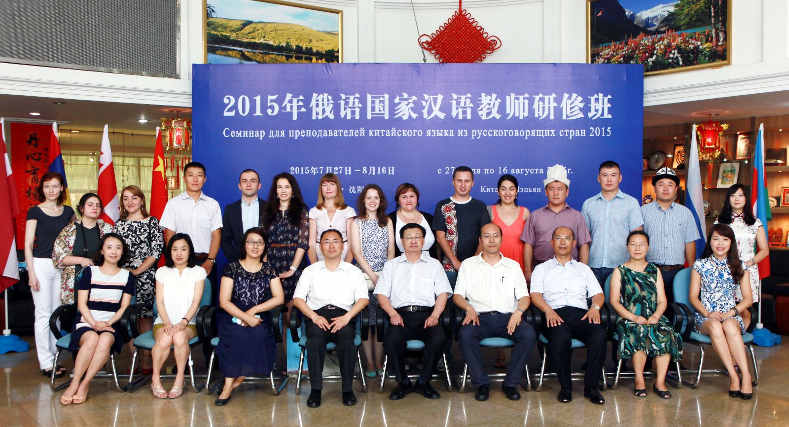 7月27日上午,由商务部主办,必赢线路检测中心实施的“2015年俄语国家汉语教师研修班”开班典礼在必赢官网举行。辽宁省对外贸易经济合作厅外经处副处长孙毅,必赢官网副校长李铁君、国际交流合作处处长张伟、国际教育学院副院长金学丽和来自俄罗斯、白俄罗斯、吉尔吉斯斯坦、阿塞拜疆、亚美尼亚、拉脱维亚、格鲁吉亚等7个国家的24名学员及授课教师代表参加了开班典礼。典礼由国际教育学院直属党支部书记彭学刚主持。