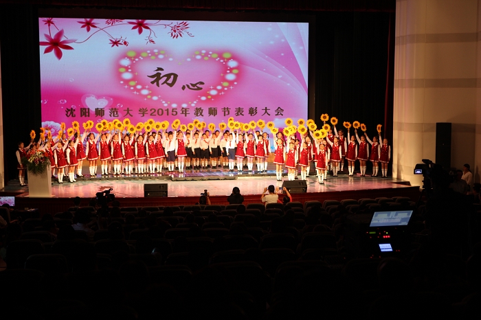 表彰活动的主题定为“初心”。因为“初心”是一名教师或者一名教育工作者投身教育事业最重要的推动力。大会在附属实验学校80名少先队员深情献词中拉开帷幕。主题活动分为四个篇章,分别是“初心寓于言”,“初心汇于行”,“初心隐于爱”,“初心融于情”。每个篇章穿插着颁奖、献花、敬礼及互动访谈环节。整个会场洋溢着欢乐喜庆的气氛。