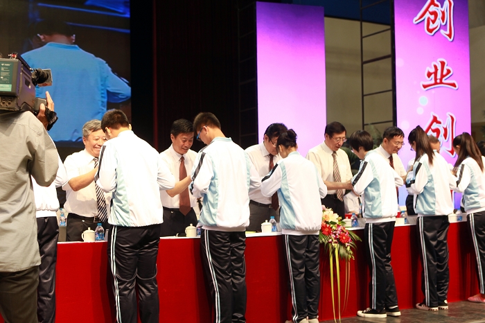 主席台前排领导为新生代表佩戴校徽