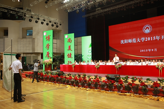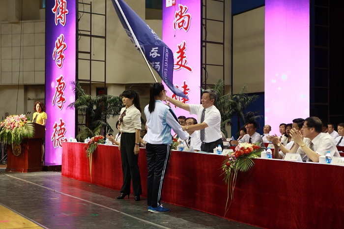 党委书记于文明从毕业生代表手中将象征沈师精神的校旗授予新生代表
