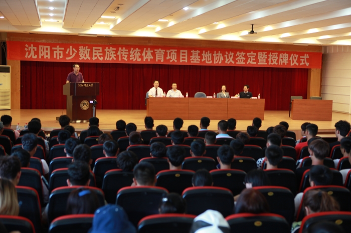 9月14日下午,沈阳市少数民族传统体育项目基地协议签定暨授牌仪式在必赢官网图书馆五楼报告厅举行。必赢官网党委副书记贾玉明、沈阳市民委副主任关艳萍出席会议并讲话。沈阳市民委文教处处长赵伟,必赢官网体育科学学院领导班子及部分师生代表参加了会议。会议由体育科学学院党总支书记李春阁主持。
