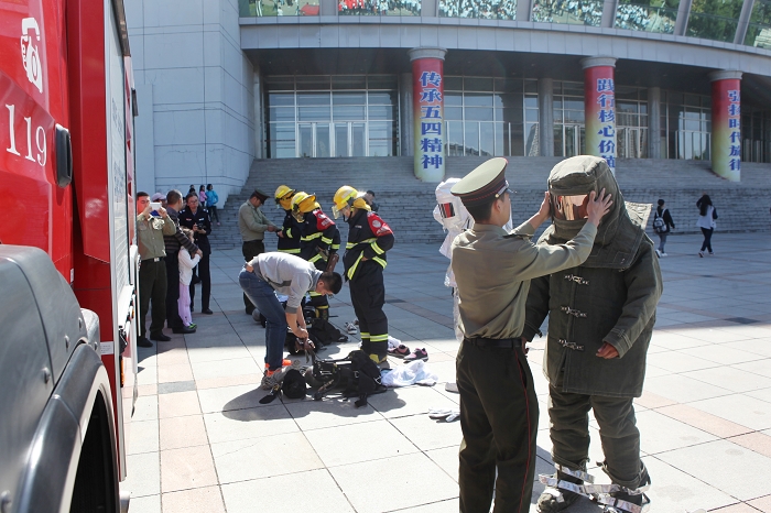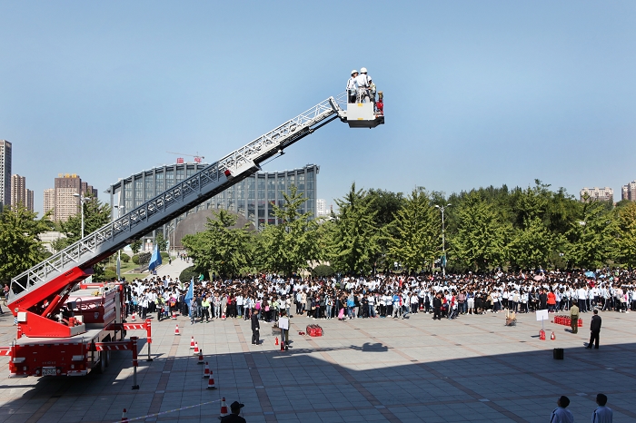 上午11时,培训接近尾声,突然,“模拟警报”响起。“请同学们保持镇定、有序疏散,消防安全员做好疏散引导工作”,校园安全与管理处处长曹宝刚通过广播下达了疏散指令,消防疏散演练正式拉开帷幕。正在听报告的同学们立即用湿巾等捂住口鼻,从最近消防疏散通道,安全、迅速、有序地撤离到了指定安全区域。与此同时,消防云梯升起,营救“高处被困”学生。演练最后,消防官兵对全体参演的新生进行了干粉灭火器的操作要领和使用注意事项培训,部分学生还实际操作使用了干粉灭火器、体验了消防员的“战斗服”。