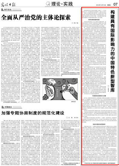 《光明日报》2015年10月18日07版,原文刊载了第一作者致公党党员、法学院王晓博士文章“加强专题协商制度的规范化建设”。