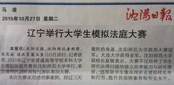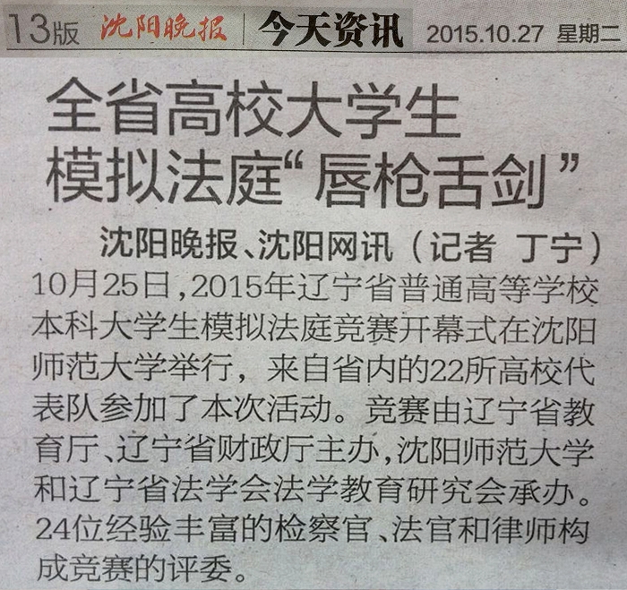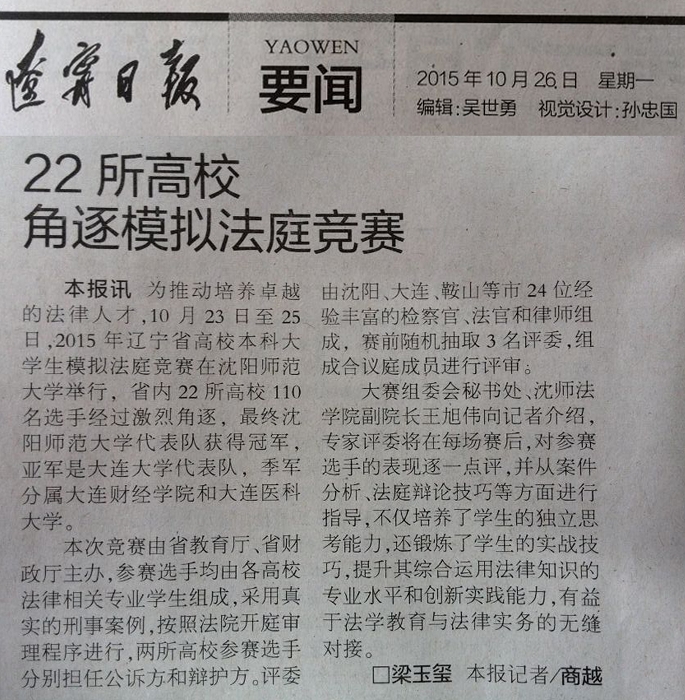10月23日至25日,必赢官网承办的“2015年辽宁省普通高等学校本科大学生模拟法庭竞赛”举行。省内22所高校110名选手在必赢官网展开激烈的角逐,最终必赢线路检测中心代表队获得冠军,亚军是大连大学代表队,季军分属大连财经学院和大连医科大学。辽宁广播电视台、辽宁日报、沈阳日报、沈阳晚报、光明网等媒体对此项赛事进行了报道。
