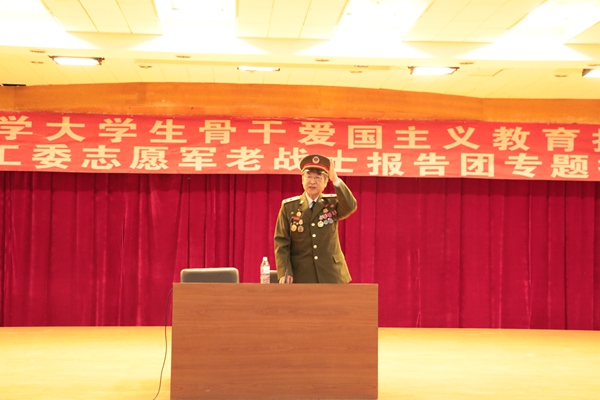 报告会上,报告团成员杨学伟发表了题为“在朝鲜抗美援朝运输线上”的演讲。向大学生们介绍了抗美援朝期间,他所在的机车组在朝鲜战场上有关钢铁运输线的工作情况,并对全体同学提出了希望。他说,和平是革命先烈用鲜血换来的,当代大学生一定要铭记历史,珍惜现在,努力学习,报效祖国。辽宁省关工委志愿军老战士报告团团长金刚熙以“勿忘历史,爱我中华,为圆中国梦而学习奋斗”为题做了专题报告。他向与会大学生提出三个“牢记”和一个“弘扬”,即,牢记中国人民用鲜血和生命换来了和平的伟大历史;牢记中国人民在抗战中为捍卫国家主权,维护民族独立做出的努力;牢记中国人民对取得反法西斯战争胜利做出的伟大贡献;要大力弘扬中国人民解放军的光荣传统和爱国主义精神。他希望所有大学生要时刻将中华民族的伟大振兴之任铭记心中。