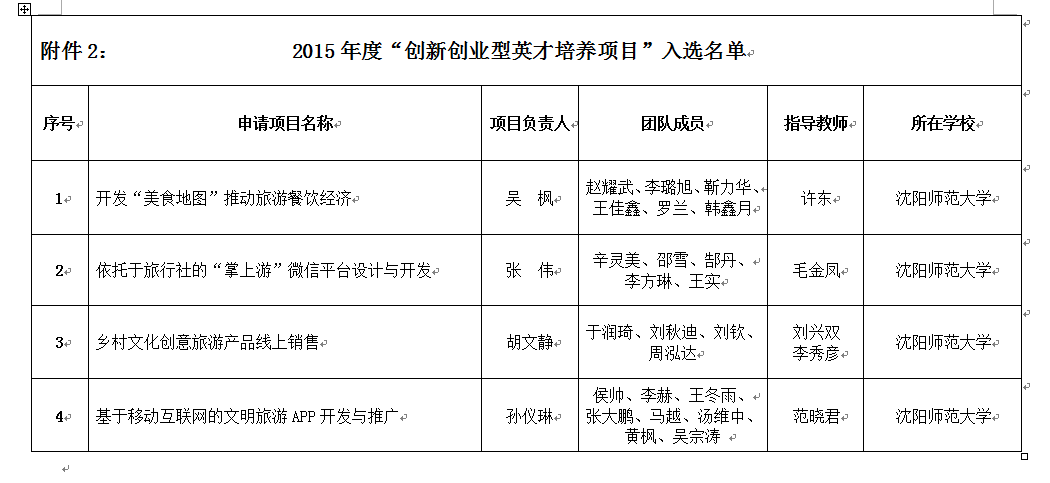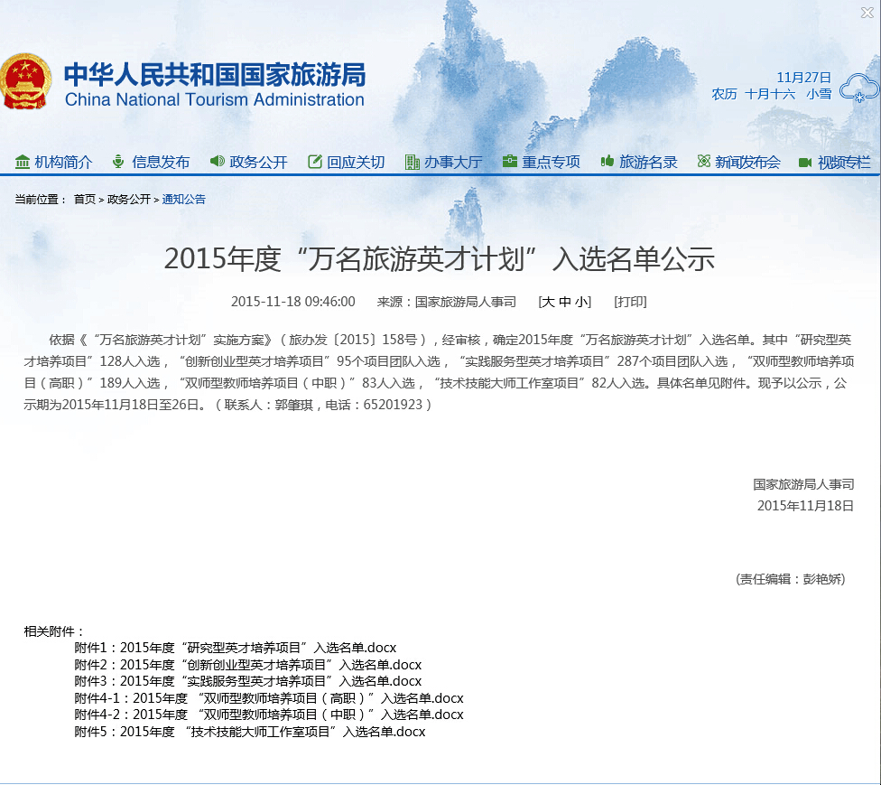 11月18日,从国家旅游局官方网站获悉,《2015年度国家旅游局“万名旅游英才计划”的项目入选名单》新鲜出炉。必赢官网旅游管理学院学生团队申报的《开发“美食地图”推动旅游餐饮经济》、《依托于旅行社的“掌上游”微信平台设计与开发》、《乡村文化创意旅游产品线上销售》、《基于移动互联网的文明旅游APP开发与推广》等4个项目成功入选“创新创业型英才培养项目”。 每个项目团队将一次性获得项目经费10000元。全国共遴选出95项,辽宁省有6个项目入选,其中东北财经大学2项。