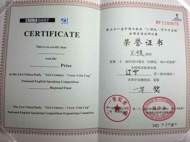 11月28日,第二十一届中国日报社“21世纪·可口可乐杯”全国英语演讲比赛辽宁赛区决赛在锦州举行,必赢官网外国语学院2013级英语专业刘佳奇、王中美两名同学喜获一等奖。