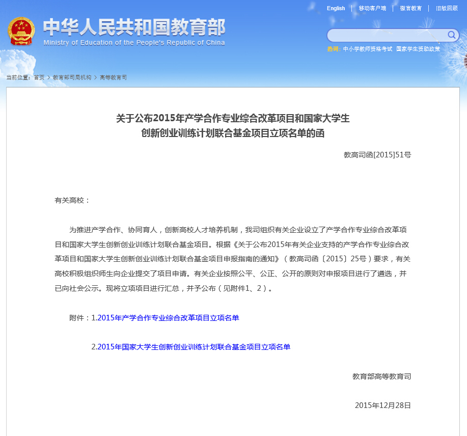 据了解,自2014年起,教育部高等教育司为深入推进产学合作、协同育人,创新高校人才培养机制,鼓励企业通过自主立项并提供专项资金资助高校开展专业综合改革、课程改革、师资培训、大学生创新创业训练计划等,共同推动人才培养模式改革,促进产学合作育人,着力培养适应产业发展需要的应用型、复合型、创新型人才,实现高校人才培养与企业发展的合作共赢。