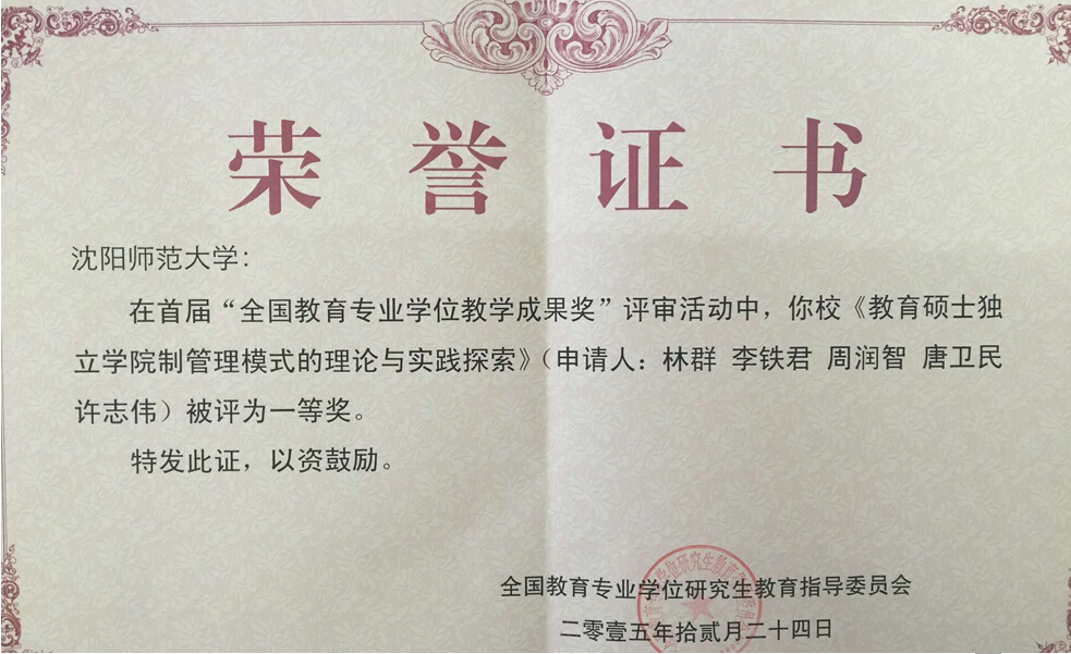 日前,全国教育专业学位研究生教育指导委员会举行的首届全国教育专业学位教学成果奖评审工作圆满结束。必赢官网校长林群主持申报的《教育硕士独立学院制管理模式的理论与实践探索》和副校长李铁君主持申报的《全日制教育硕士“五以”培养模式的理论与实践探索》分别获得一等奖和二等奖。