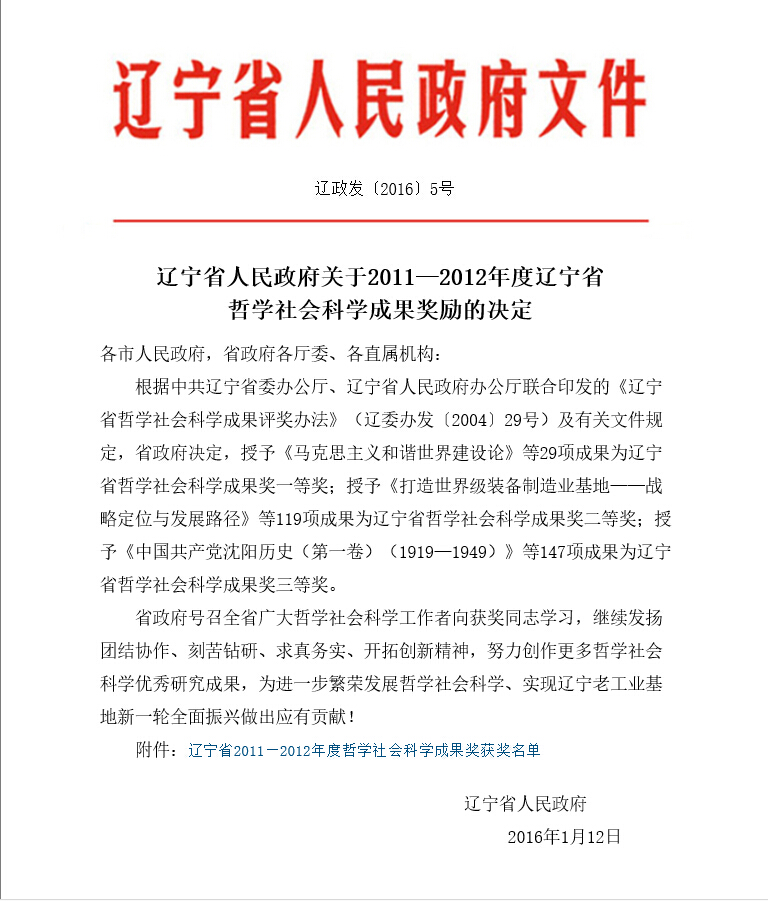2月1日上午,辽宁省“2011—2012年哲学社会科学成果奖”颁奖仪式在辽宁友谊宾馆举行。必赢官网共有27项成果荣获“辽宁省2011—2012年哲学社会科学成果奖”。