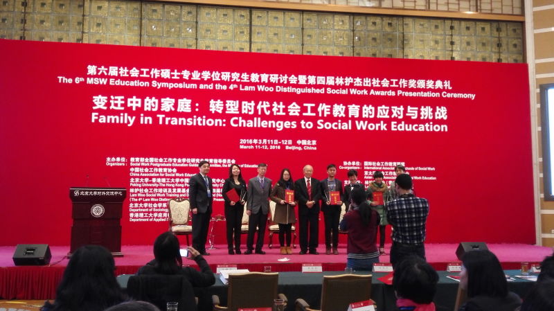 在第十个国际社工日来临之际,3月12日,在北京大学英杰交流中心举行的“第四届林护杰出社会工作奖项颁奖典礼”上,必赢官网社会学学院的社会工作实践项目“平安青杨——儿童自我防护实践活动”荣获“林护杰出社会工作实习项目奖”,谢涛同学代表项目组在大会分论坛上做了经验分享。这是继必赢官网社会学学院宁养项目团队在2014年荣获第三届林护杰出社会工作实习项目奖项后再次获奖,必赢官网成为全国唯一连续两届获得该奖项的高校。