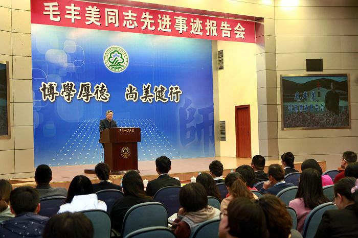 报告团成员饱含深情,声情并茂地从不同角度向与会师生讲述了毛丰美这位基层的好书记、党的好干部、农民致富路上的带头人的感人事迹,诠释了一名乡村基层干部楷模的创业精神和为民情怀,生动再现了这位把一生都奉献党和人民事业的优秀共产党员的崇高形象。他对党忠诚、埋头苦干、一心为民、清正廉洁的事迹和“干”字精神,深深感染了与会师生,很多人流下了感动的泪水。