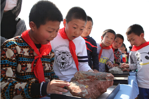 在学校操场,博物馆向孩子们展示了恐龙、古鸟、古昆虫及木化石等27件精美的化石标本,引起孩子们浓厚的兴趣;孩子们还参加了植物标本手工制作,并观看了《会飞的恐龙》科普电影。博物馆还向39名留守儿童捐赠了博物馆原创的科普丛书,并为在“神秘的远古生物”征文比赛中获奖的学生颁发了奖品和证书。