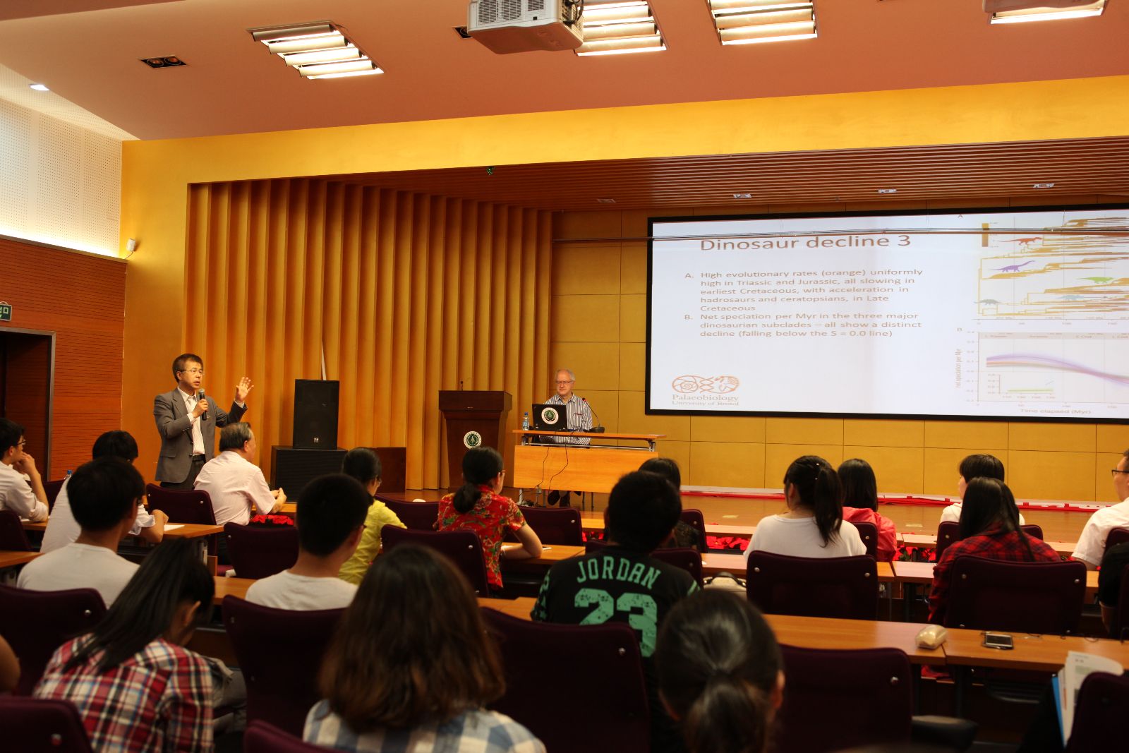 Benton院士结合多年对K-Pg事件以及恐龙演化和灭绝的深入研究,系统阐述了6600万年前行星撞击地球的理论及事实依据;他结合近年来国际学术界关于火山活动对恐龙灭绝可能产生的影响,提出了对恐龙灭绝采用综合研究的新理念。Benton院士还特别介绍了当今国际最前沿的有关物种演化及灭绝研究方法和最新成果等。Benton院士的报告内容丰富,观点新颖,大量图片及图表直观生动,给师生们奉献了一道丰盛的学术大餐。报告结束后,大家踊跃提问,讨论十分热烈。