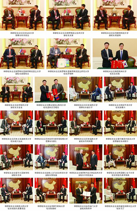会见中,林群校长与美国福特海斯州立大学就进一步优化两校中外合作办学机构、开展国际商科认证等方面工作进行了探讨;与黎巴嫩圣约瑟夫大学就孔子学院开办十周年之际,进一步加强建设管理,制定未来发展规划进行了交流;与爱尔兰国家学院就申报两校软件工程专业中外合作办学项目,开展硕士“2+1”交流合作进行了商谈;与日本城西大学、北海道教育大学、别府沟部短期学园、福井大学就日语专业师生开展长短期交流、教师攻读博士学位等项目进行了洽谈;与韩国平泽大学、敬仁女子大学、高神大学、大邱大学、越南人文社会科学大学就留学生来校学习汉语、开展寒暑假短期研修及中国文化体验等项目进行了商讨;与俄罗斯车里雅宾斯克国立大学、车里雅宾斯克国立师范大学、乌拉尔林业技术大学就俄语专业师生开展长短期交流进修、引进外籍专家等项目进行了商讨;与白俄罗斯国立大学、蒙古国国立教育大学分别就粮食贮藏加工、能源净化以及教育学、心理学等专业的交流合作进行了探讨;与台湾新竹教育大学、铭传大学、朝阳科技大学、金门大学就师生短期研修、产学研合作、创新创业教育等方面交流合作进行了洽谈。