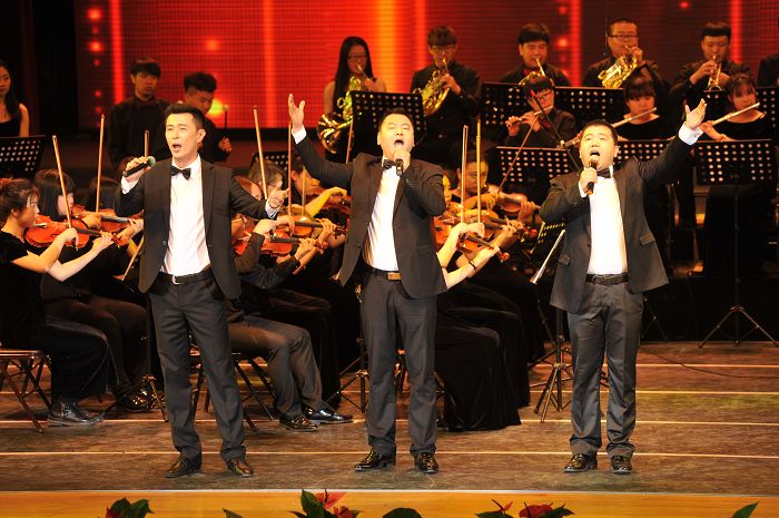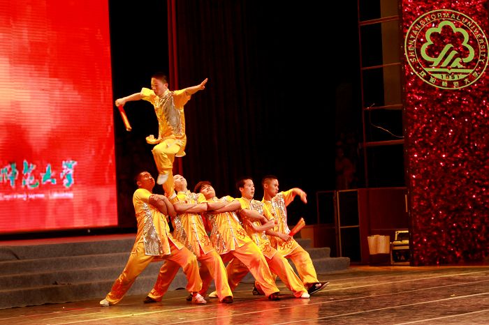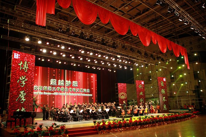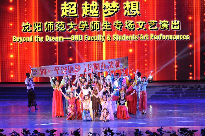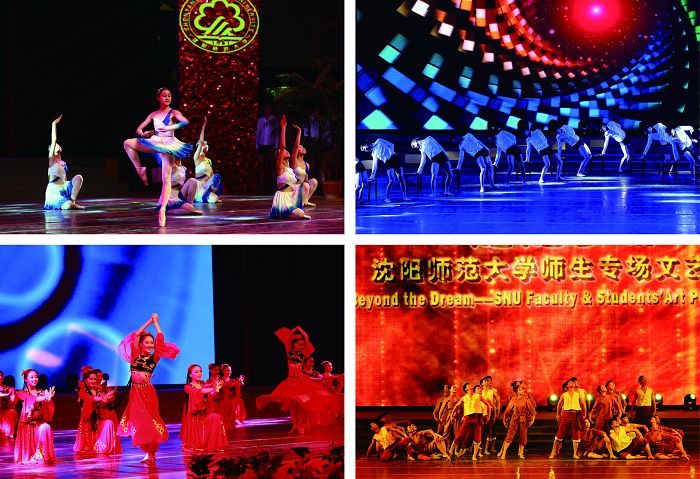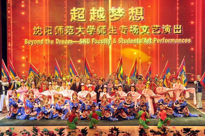 音乐学院青年交响乐团带来的大型交响乐《红旗颂》拉开了文艺演出的帷幕,铿锵激昂的乐曲凝聚着师大人对祖国的真挚祝福;音乐学院表演的男声三重唱《我的太阳》,高昂洪亮的歌声表达了对美好理想的追求;戏剧艺术学院的舞蹈《闯关东》和《奔放》震撼人心,诠释了对生命和生活的执着追求,喻示了沈师人在追梦路上自强不息、创业创新的精神传统;学前与初等教育学院“春之声”合唱团表演的《有一个美丽的地方》和《装扮蓝色的地球》婉转动听,歌颂了青山绿水蓝天和美好的生活家园;悠扬精湛的京胡和板胡协奏《对腔》展示了中国民乐的独特魅力,表现了实现中华民族伟大复兴的中国梦主题思想;优美活泼的舞蹈集锦《梦开始的地方》与校园歌曲联唱表达了全校师生,尤其是青年学生对青春、对生活、对未来的美好憧憬,展现了沈师学子朝气蓬勃的精神状态;系列武术表演《中华威风》生龙活虎、惊心动魄,再现了中华儿女壮志凌云的进取精神;国际教育学院来自12个国家的23名留学生代表用不同语言演绎的歌曲《我和你》感情真挚,道出了“同一个汉语梦,共圆在沈师”的心声;最后,文艺演出在美轮美奂、酣畅淋漓的京剧表演——《百花盛开》中圆满落幕。演出现场座无虚席,高潮迭起,喝彩声、掌声不绝于耳,与会中外嘉宾对整场演出啧啧赞叹,深受现场气氛的感染,不时同舞台上的演员互动。