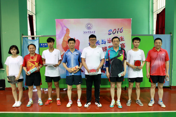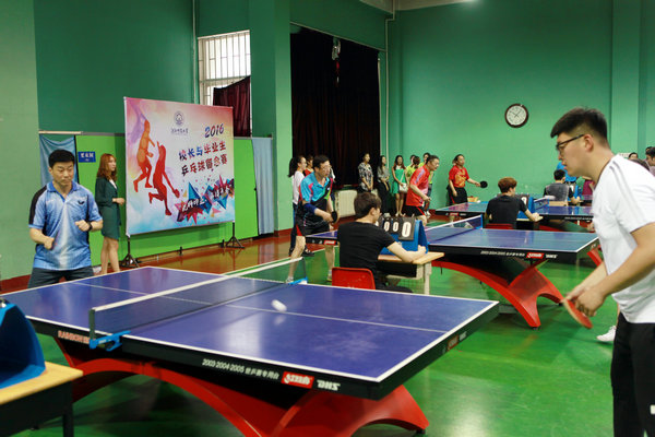 6月23日上午,正值2016届毕业生离校前夕,由校团委学生会发起的以“沈师印迹﹒乒搏青春”为主题的校长与毕业生乒乓球留念赛在学校训练馆举行。
