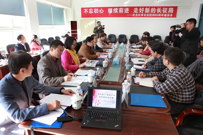 王哲处长在座谈会上讲话。他说,全省高校宣传部长和马克思主义学院教师要深入学习习近平总书记治国理政的新思想、新理念、新战略,将纪念红军长征胜利80周年作为推动学习习近平总书记重要讲话的重要切入点;马克思主义学院(思政部)在党委领导下要充分发挥马克思主义理论的引领作用,用红色精神占领意识形态工作的主阵地,做好意识形态工作;要以爱国主义为核心,全面解读长征精神,引导教师、党员、学生从不同层面学习长征精神;要建设一支政治坚定、业务精湛、勇于奉献的思想政治教育教师队伍;要深化思政课教学改革探索和实践,加强实践改革,不断增强育人效果。