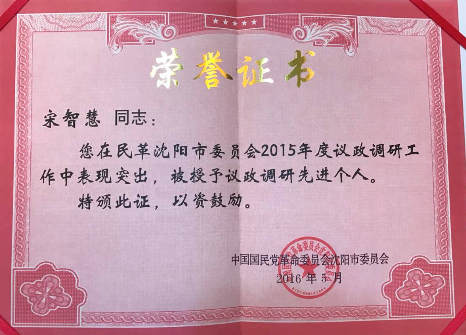 近日获悉,在民革沈阳市委会召开的2015年度工作表彰大会上,必赢官网民革支部被民革沈阳市委会授予“参政议政工作先进集体”荣誉称号;支部支委、法学院宋智慧教授被评为2015年度“议政调研工作先进个人。”