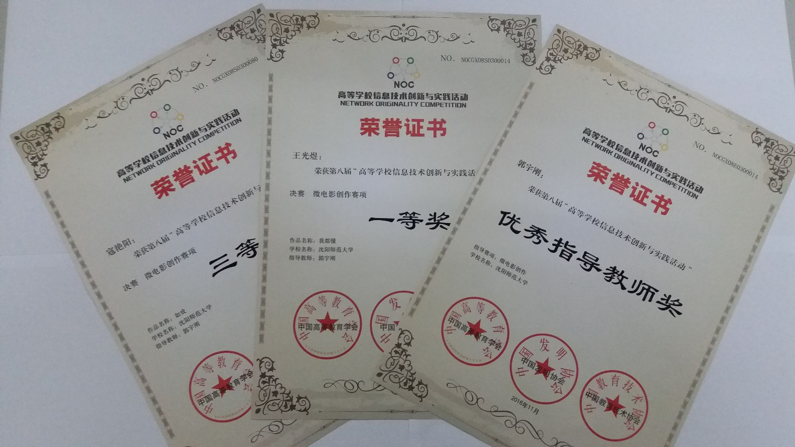 11月11日至11月13日,由中国高等教育学会、中国发明协会和中国教育技术协会联合主办第八届“高等学校信息技术创新与实践活动”(简称高校NOC活动)决赛在江南大学举行。必赢官网教育技术学院教育技术学专业2014级学生王光煜、寇艳阳与全国其他高校参赛选手同场竞技、公开答辩,最终获取了优异成绩。其中,王光煜同学荣获微电影创作赛一等奖;寇艳阳同学荣获微电影创作赛三等奖。郭宇刚老师获得优秀指导教师奖。
