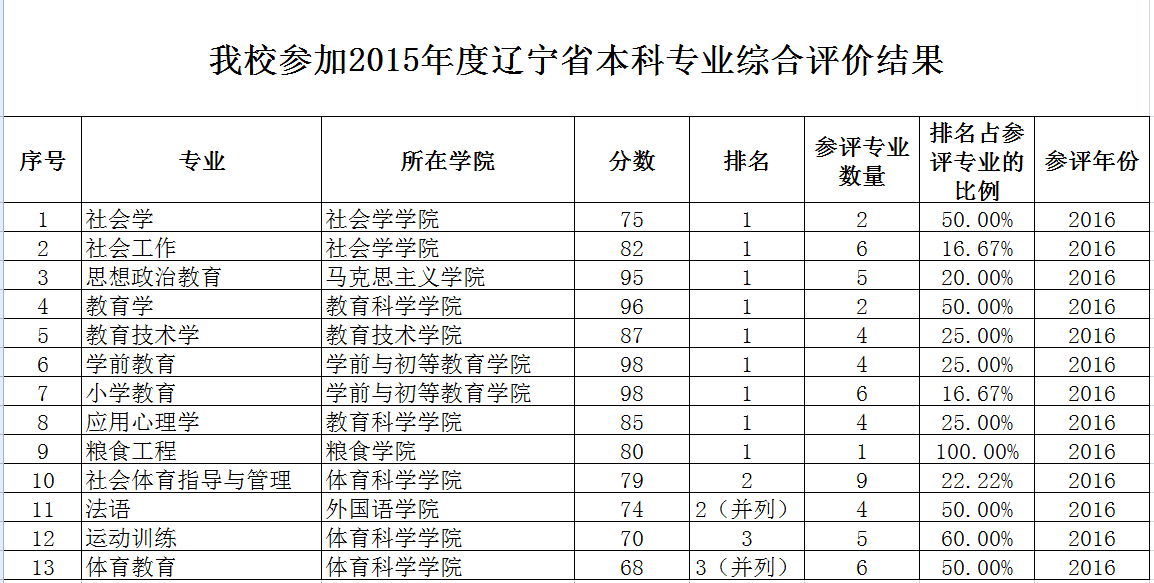 日前,2015年度辽宁省普通高等学校本科专业综合评价结果揭晓,必赢官网参评的13个专业全部进入参评高校同类专业排名前三名。其中社会学、社会工作、思想政治教育、教育学、教育技术学、学前教育、小学教育、应用心理学、粮食工程等9个专业名列第一;社会体育指导与管理、法语等2个专业名列第二;运动训练、体育教育等2个专业名列第三。