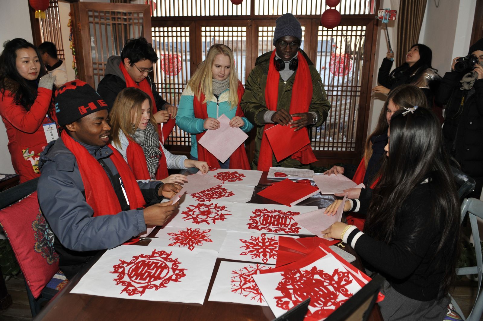 活动共分为两个阶段。23日下午,留学生们抵达盘锦市大洼区石庙子村,欢聚在红灯高挂、年味十足的中国传统民俗,体验“嬉冰雪、泡温泉、住民宿、过大年”的中国习俗。在中国非物质文化遗产传承人的指导下,留学生们兴高采烈地学习剪纸,裁剪出自己喜欢的图案;中国书法让留学生们着迷,纵情书写着福字与春联,浓浓的墨香将辽河口的民俗民风深深地印刻在留学生的脑海里。夜幕降临,伴随着热闹的鞭炮声,大家围坐在一起学习包饺子,沉浸在一片欢声笑语之中。当晚,留学生们还参观了盘锦广厦艺术街,琳琅满目的旅游工艺品和书画作品让大家赞叹不已,爱不释手,感受到中国文化的神奇瑰丽。