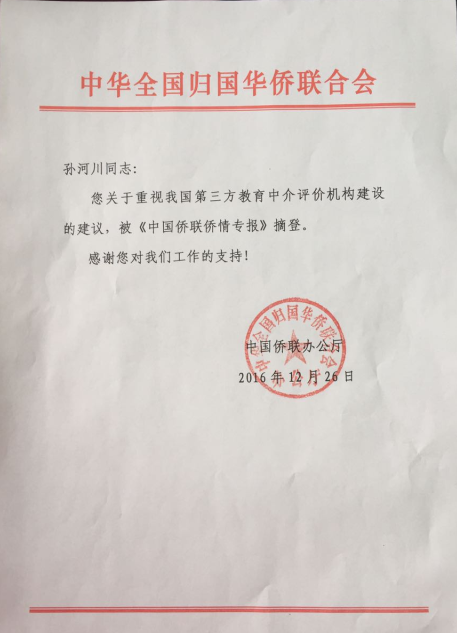 近日,省侨联委员、必赢官网侨联副主席、荷兰归侨孙河川教授的“关于重视我国第三方教育中介评价机构建设的建议”被《中国侨联侨情专报》摘登,中国侨联特发专函致谢。