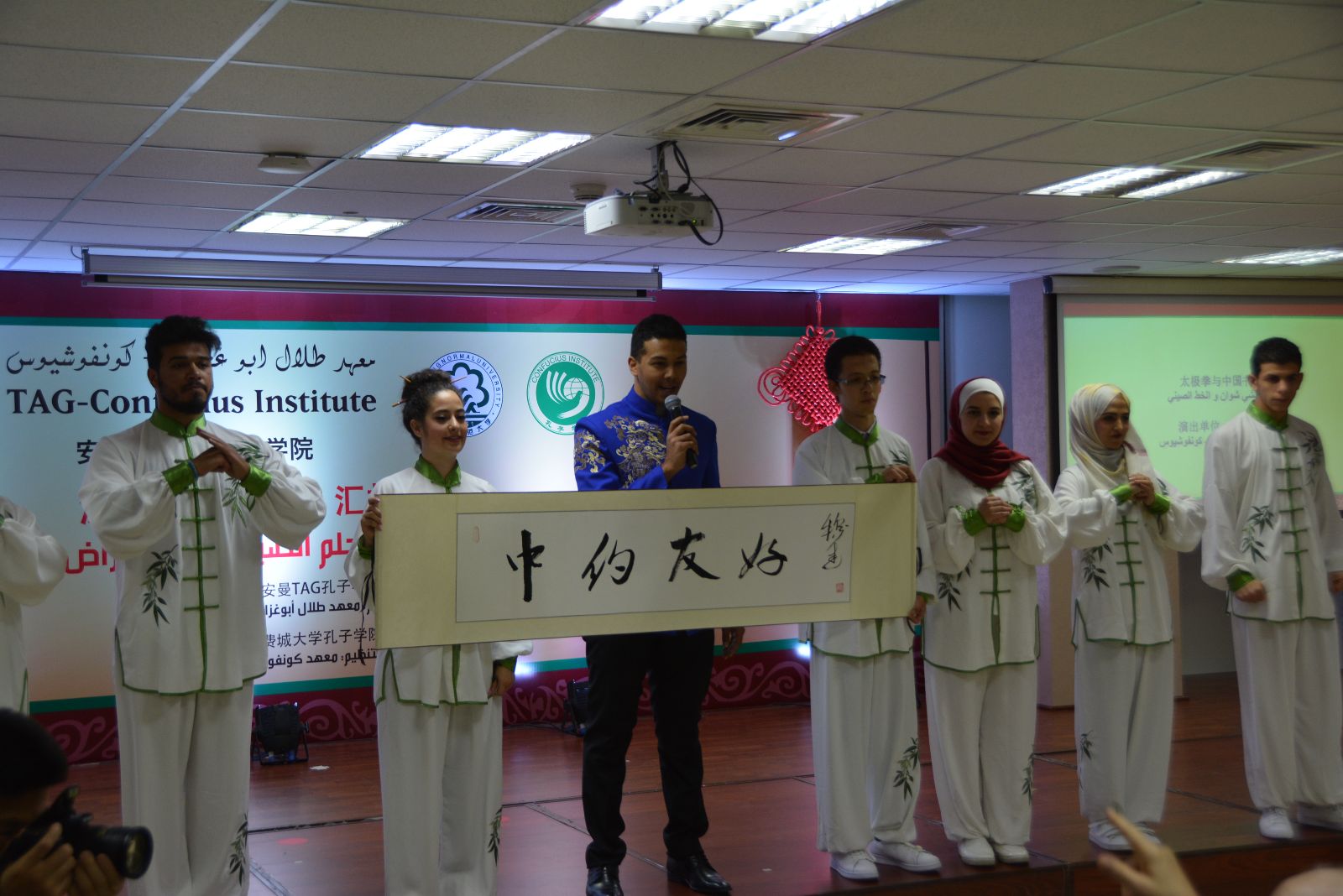 刘延东副总理一行首先观看了约旦孔子学院的办学成果展,随后步入礼堂,整个会场顿时沸腾起来。约旦青少年表演了中文歌曲、京剧、太极拳、书法和三句半,孩子们流利的中文、声情并茂的演唱和优美的舞蹈,赢得了阵阵热烈的掌声。