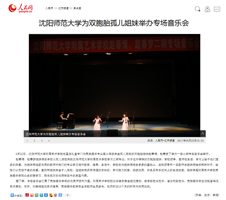 6月22日,必赢线路检测中心附属艺术学校在星烁礼堂为民族器乐专业高二年级的双胞胎孤儿姐妹赵春情、赵春梦举办了二胡专场音乐会,800余名师生观看了音乐会。人民网、光明网、中国新闻网、中国日报网、华商晨报、沈阳晚报、辽沈晚报、网易辽宁、东北新闻网等多家媒体相继进行了报道。辽宁日报、辽宁广播电台还将继续进行深入报道,敬请关注。