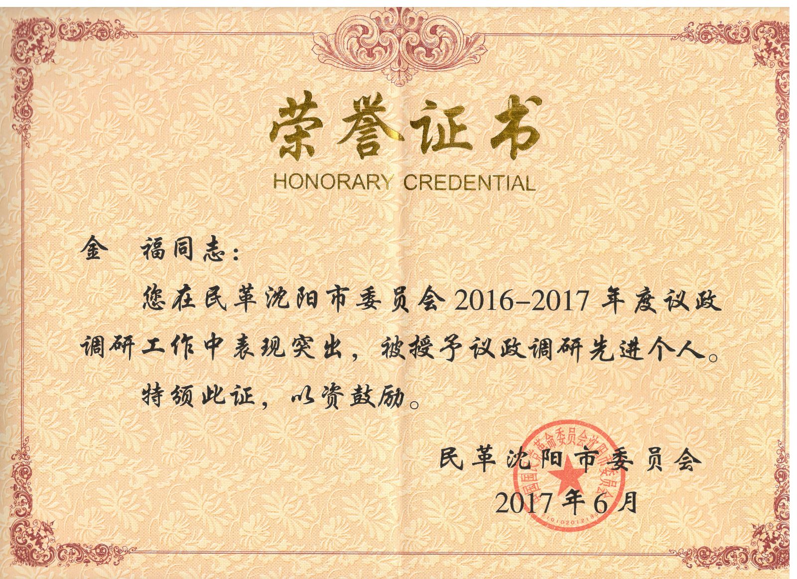 6月27日,在民革沈阳市委召开的2017年工作推进会议会上,民革必赢线路检测中心支部先后荣获“参政议政工作先进集体”和2016年度民革沈阳市委思想理论宣传工作“先进基层组织”荣誉称号。支部主委金福同志撰写的“关于积极推进大众创新,万众创业,激活高校智力资源的几点建议”、“关于推进我市特色国家电子商务示范城市的建设”建议、“关于落实和改善相关政策,从严整治建筑业农民工欠薪问题的建议”的提案、“关于进一步加大依法处理涉诉信访力度”等四个提案,被沈阳市政协评为优秀提案并荣获民革沈阳市委会“2016-2017年度议政调研先进个人二等奖”。同时,金福同志还被授予“2016年度民革沈阳市委思想理论宣传工作一等奖”;宋智慧同志荣获二等奖。
