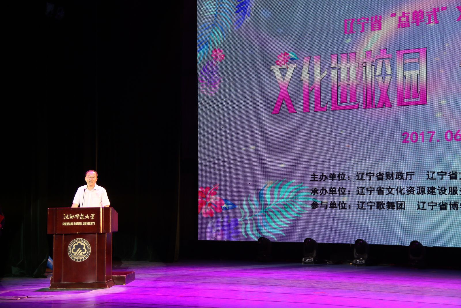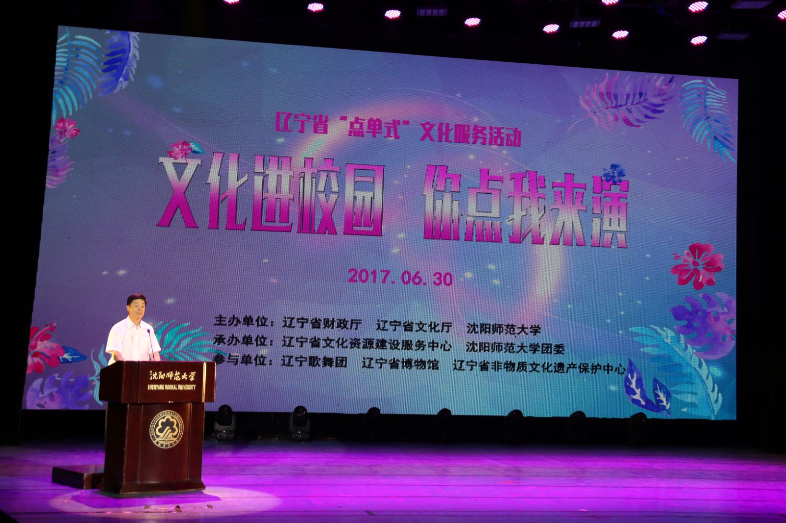 省文化厅副厅长杨世涛代表主办单位讲话。他指出,本次活动是按照省财政厅和省文化厅的工作部署,以党的十八大、十八届三中、四中、五中、六中全会和习近平总书记关于增强文化自信和供给侧改革的重要讲话精神为指引,认真贯彻落实公共文化服务保障法,发挥公共文化服务政府主导作用,保障公民参与文化活动的权益,转变工作思路,变“政府端菜”为“群众点菜”,按需提供文化服务,切实提高公共文化服务效能,不断助推辽宁省文化领域结构性改革。同时,希望在校师生能够积极参与活动,积极进行“点单”,认真反馈活动情况,为今后的活动提供有效的信息反馈。