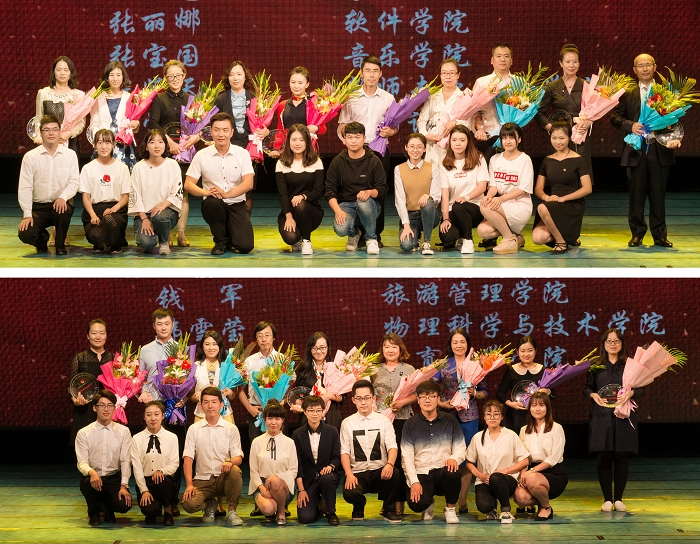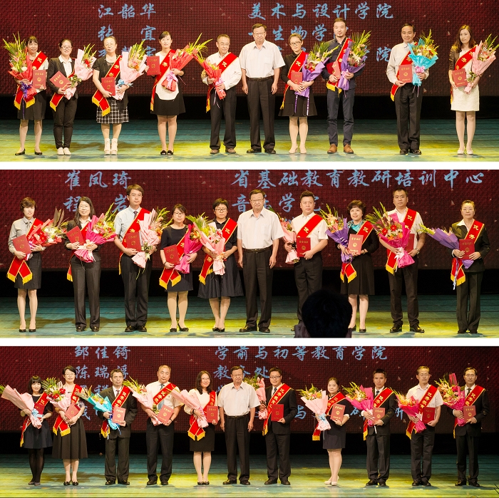 表彰大会的颁奖环节形式新颖,引人入胜,在青年教师迟旭和学生周玉峰的主持下有序展开,主题定为“逐梦”,以教师的“中国梦”——“育人梦”贯穿始终,分为逐梦谱华章、逐梦踏歌行和逐梦颂恩情三个篇章。每个篇章都将先进集体和优秀个人的事迹短片呈现给大家,在学生深情诵读颁奖词后,校领导为获得表彰的5个先进集体、18名优秀教师、10名优秀教育工作者颁发了获奖证书和奖牌。由学生代表为19名第七届“我心目中的好老师”颁发了奖杯。表彰大会在诗朗诵《用爱铸师魂》中缓缓落幕。表彰大会展现了优秀教职工的良好精神风貌,激发了全校教职员工恪尽职守育人才、立足岗位做奉献的意识和动力,为广大教师送上了一份特别的节日礼物。