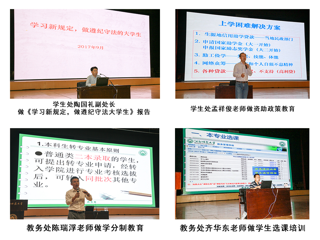 在学校集中教育的基础上,各学院结合本单位实际,围绕社会主义核心价值观引领、专业思想和专业学习、学业规划、职业规划、学生安全和生活适应等多个角度和层面开展了丰富多彩、形式活泼的新生入学教育活动。