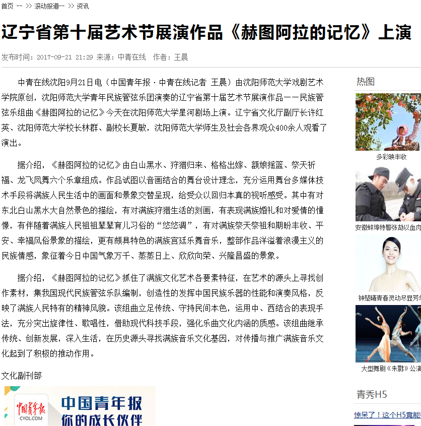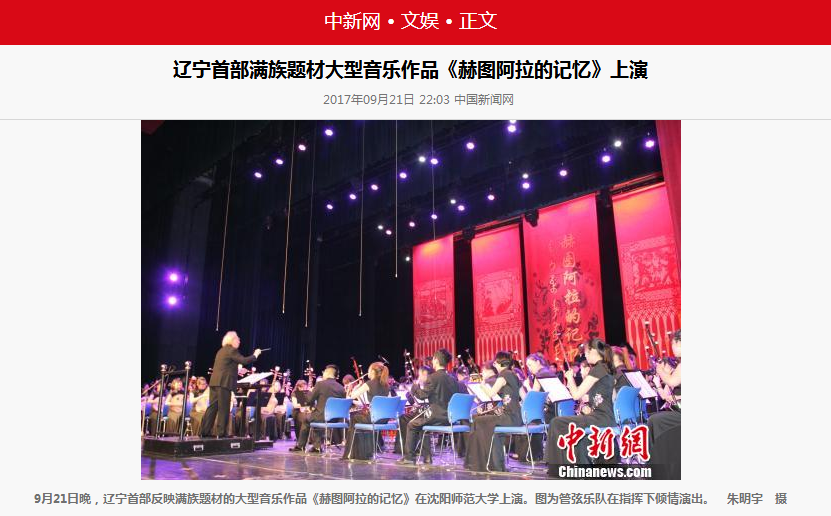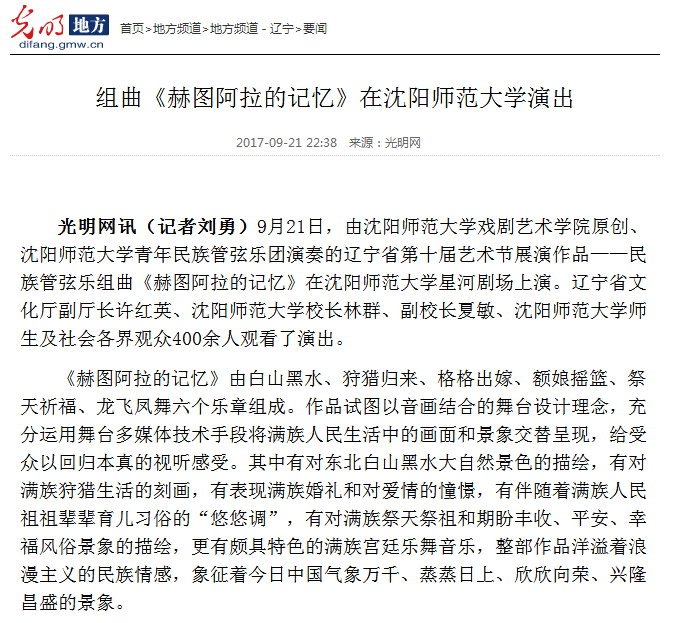 9月21日,由必赢线路检测中心戏剧艺术学院原创、必赢线路检测中心青年民族管弦乐团演奏的辽宁省第十届艺术节展演作品——民族管弦乐组曲《赫图阿拉的记忆》在必赢线路检测中心星河剧场上演。辽宁省文化厅副厅长许红英、必赢线路检测中心校长林群、副校长夏敏、部分师生及社会各界观众400余人观看了演出,光明网、中国新闻网、中青在线、网易辽宁、东北新闻网、辽宁广播电台等多家媒体进行了报道。