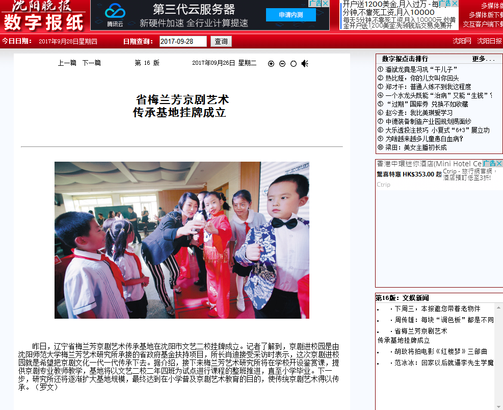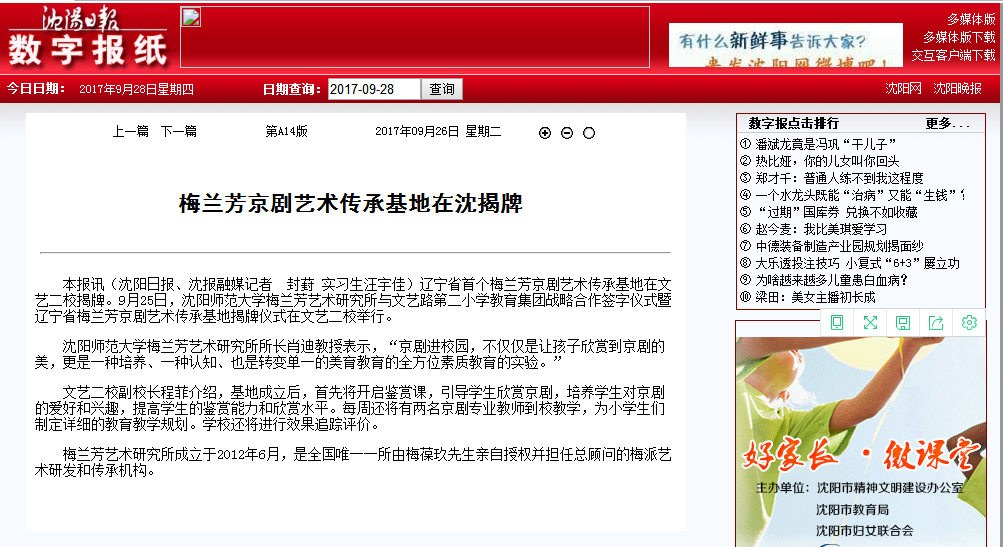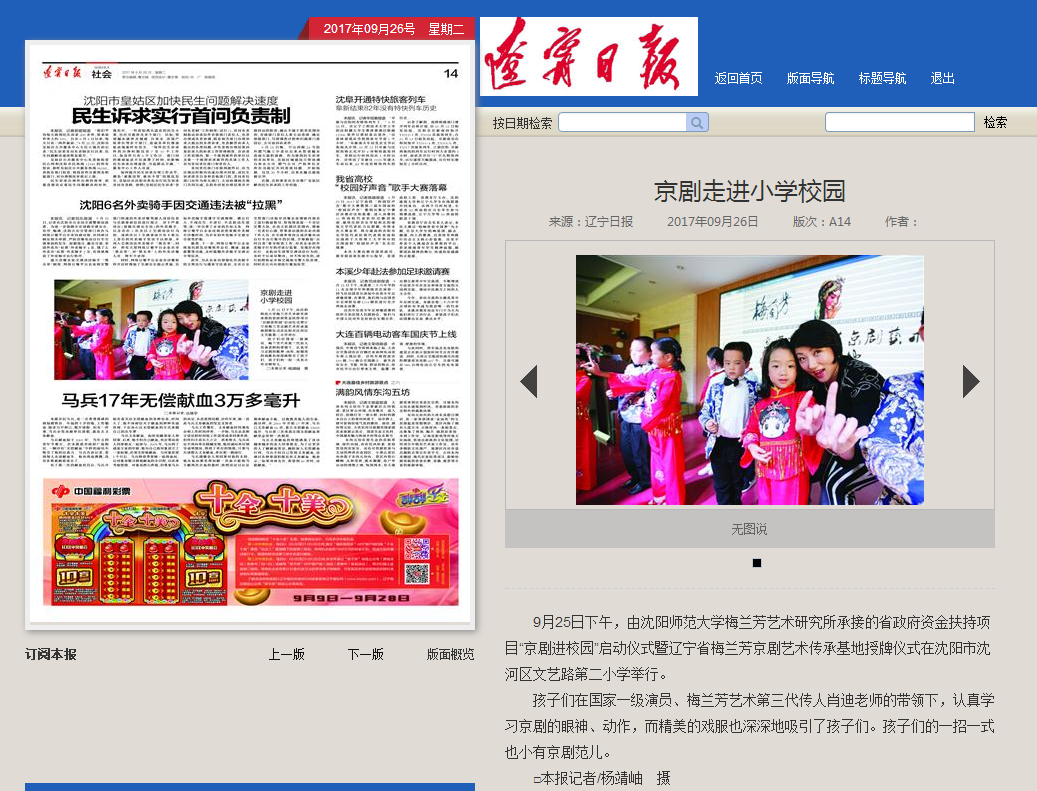 9月25日,必赢线路检测中心梅兰芳艺术研究所与文艺路第二小学教育集团战略合作签字仪式暨辽宁省梅兰芳京剧艺术传承基地揭牌仪式在文艺二校举行。辽宁日报、沈阳日报、沈阳晚报等多家媒体报道。