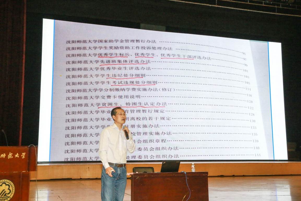 9月11日,学生处在2017级新生入学教育环节,组织全体新生集中学习了《新规定》。学生处副处长陶国礼作专题报告。孟祥俊老师就《新规定》相关内容做了详细解读和说明。