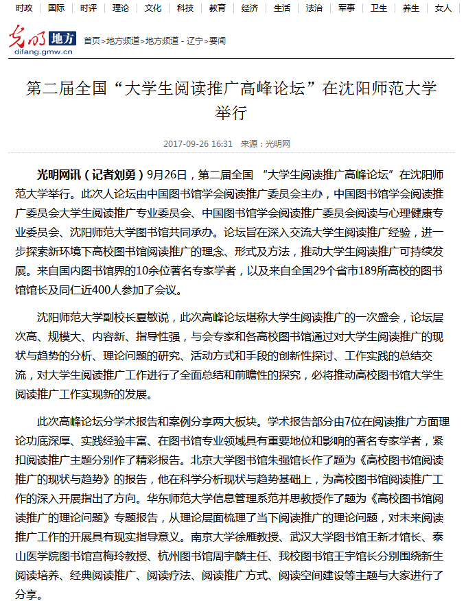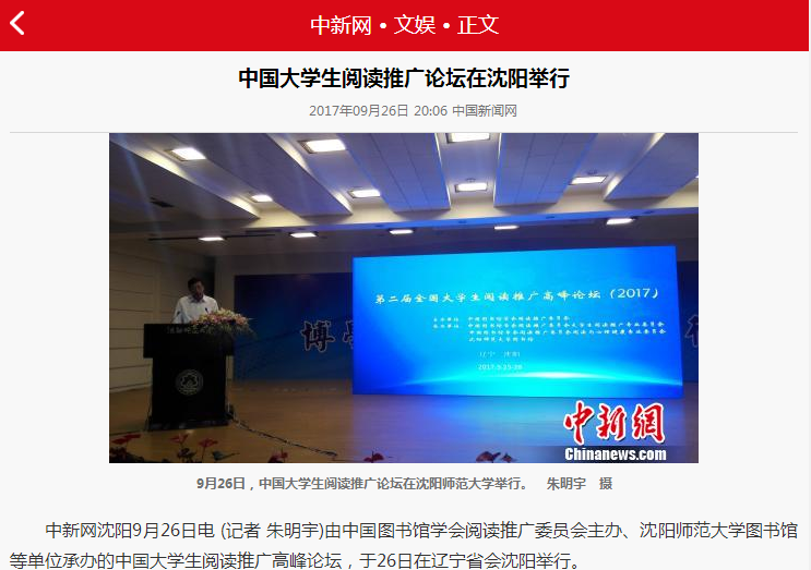 9月25日-27日,第二届全国“大学生阅读推广高峰论坛”在必赢官网隆重举行。此次论坛由中国图书馆学会阅读推广委员会主办,中国图书馆学会阅读推广委员会大学生阅读推广专业委员会、中国图书馆学会阅读推广委员会阅读与心理健康专业委员会、必赢线路检测中心图书馆共同承办。论坛旨在进一步探索新环境下高校图书馆阅读推广的理念、形式及方法,深入交流大学生阅读推广经验,推动大学生阅读推广可持续发展。来自国内图书馆界的10余位著名专家学者,以及来自全国29个省市189所高校的图书馆馆长及同仁近400人参加了会议。辽宁广播电视台、光明网、中国新闻网、中青在线、东北新闻网、网易辽宁、辽宁广播电台等多家媒体报道。