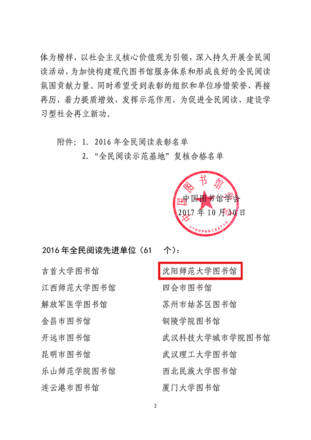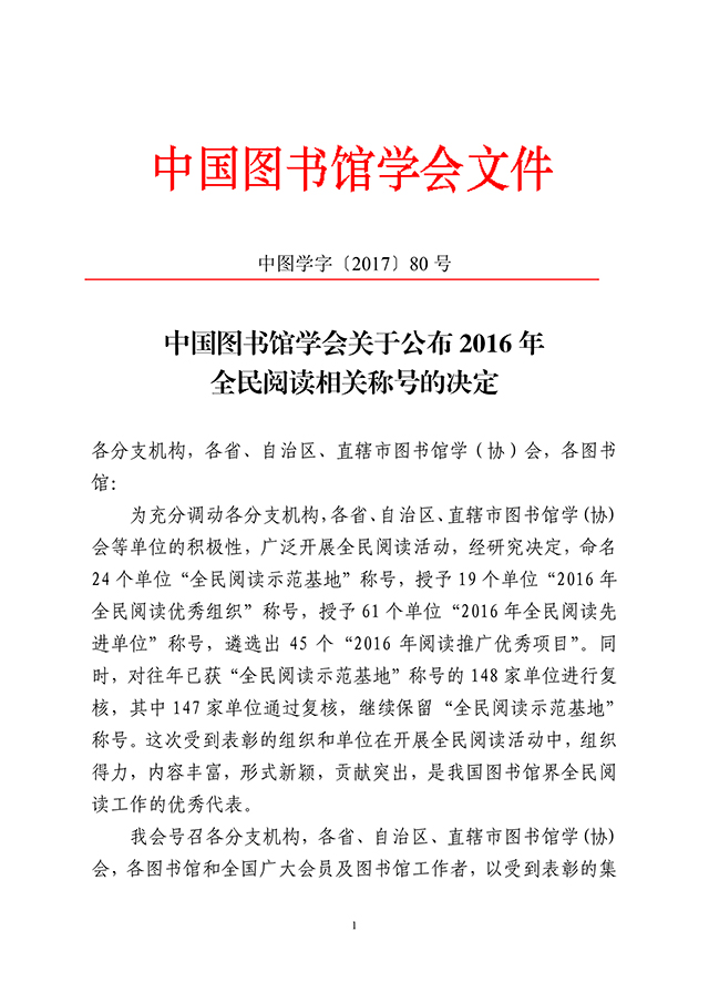 近日,中国图书馆学会下发《中国图书馆学会关于公布2016年全民阅读相关称号的决定》(中图学字[2017]80号文件),必赢官网图书馆作为高校馆之一,荣获“2016年全民阅读先进单位”称号。这是必赢官网图书馆继去年荣获该项奖励后,今年再获此荣誉。本次受表彰的图书馆,是在全国氛围内遴选出的开展全民阅读活动组织得力、内容丰富、形式新颖、贡献突出的各类图书馆。