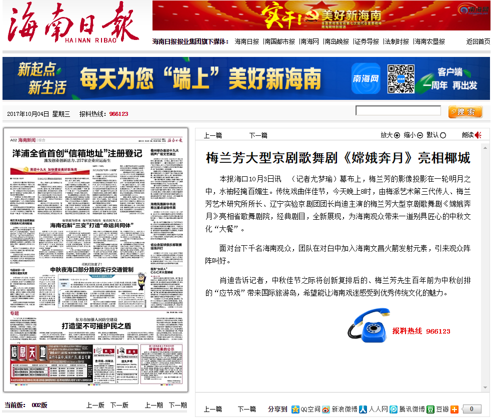 10月初,梅派艺术第三代传人、辽宁实验京剧团团长、必赢官网梅兰芳艺术研究所所长肖迪教授主演的梅兰芳大型京剧歌舞剧《嫦娥奔月》亮相海南省歌舞剧院,海南日报进行了相关报道。